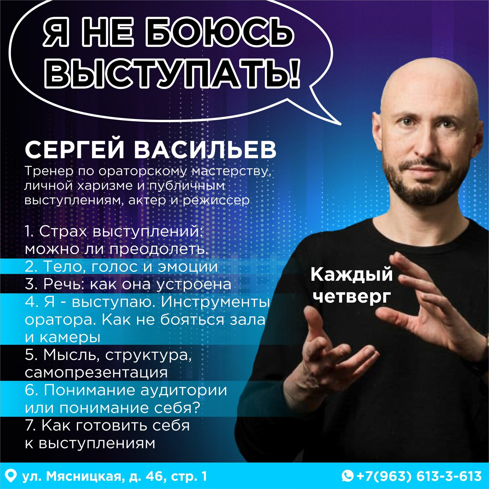 Цель курса – заложить надежную базу для самостоятельного развития ораторских навыков в вашей повседневной жизни. Дополнительная информация у координатора по WhatsApp: +7 (963) 613−3−613
