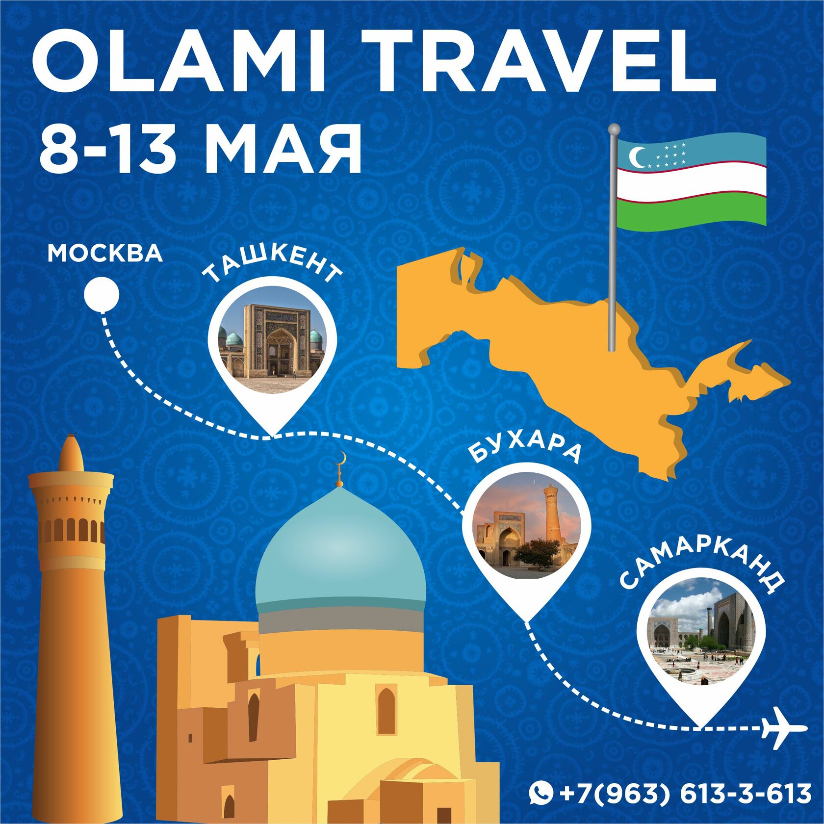 Олами отправляется в путешествие в эту уникальную страну, планируя посетить 3 города: Ташкент, Самарканд и Бухару.