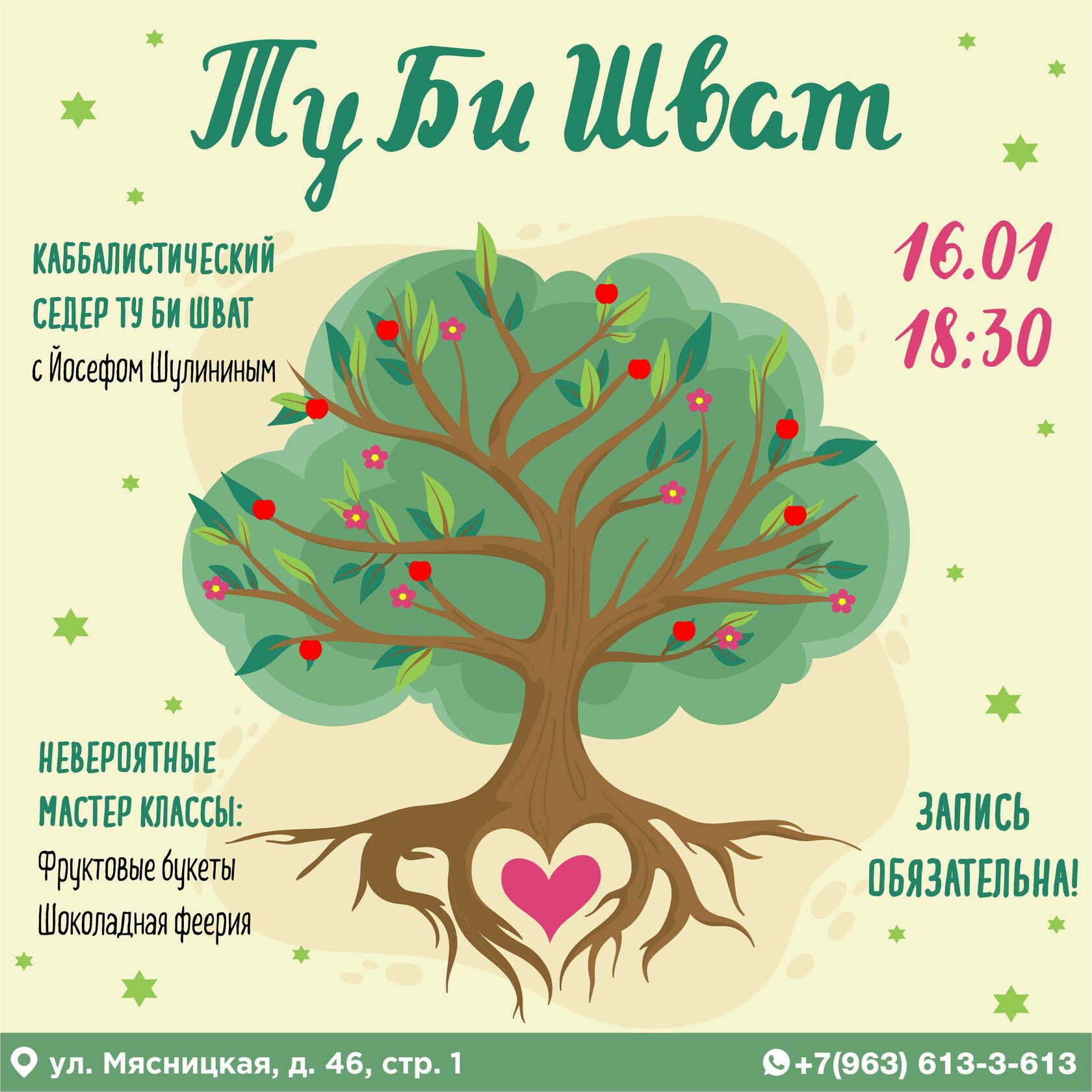 Давайте насладимся подарками Творца в Ту би Шват! Дополнительная информация у координатора по WhatsApp: +7 (963) 613−3−613